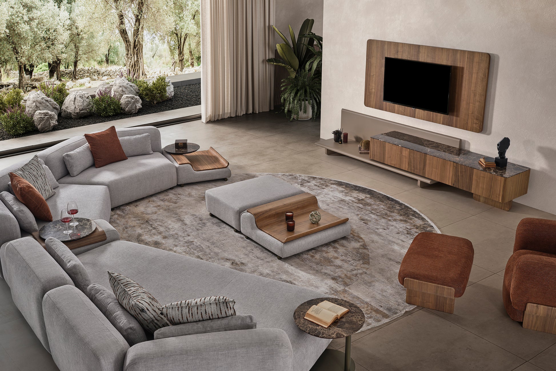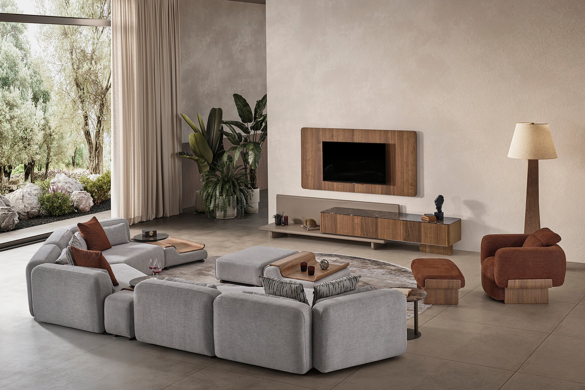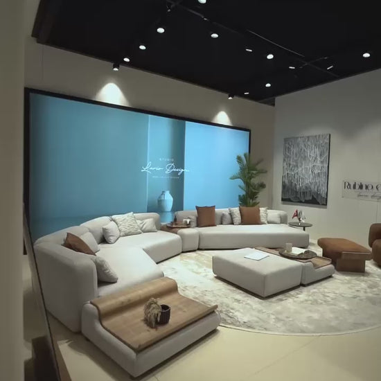 Corner Module Sofa 5 Pc + Single Armchair + Leg Rest + Center Table + Puff + Side Table with Marble top + Side Table with Wooden Top.