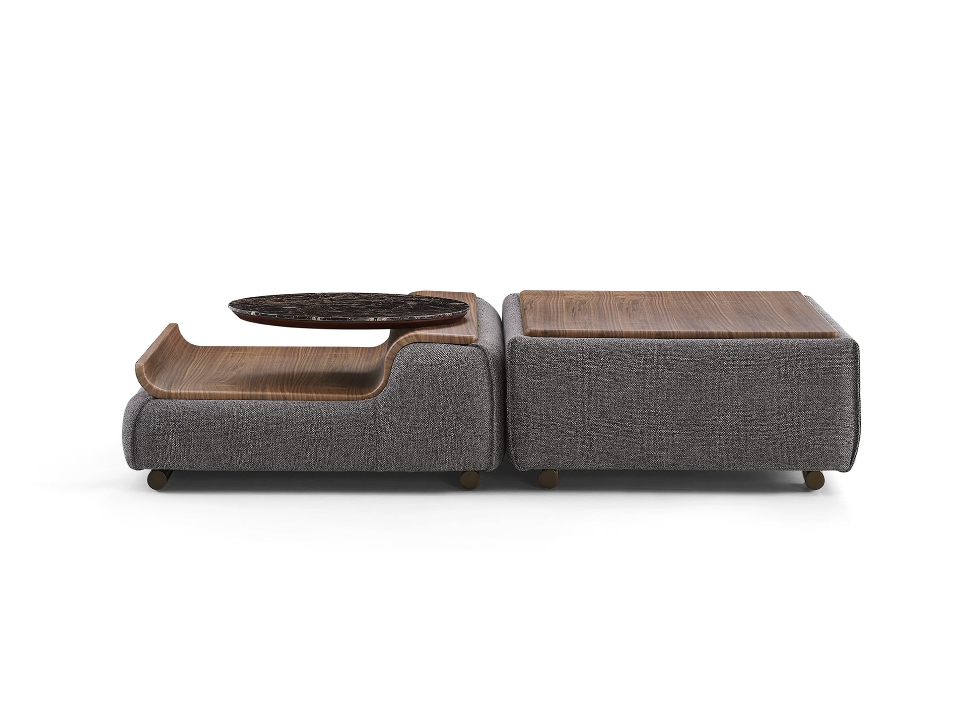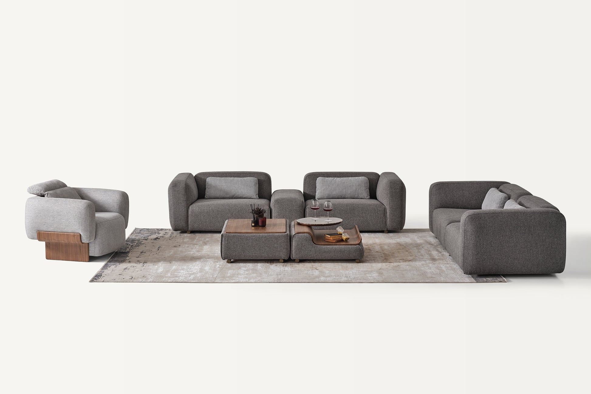3 Seater Sofa + 3 Seater Sofa with Middle Module + 1 Single Seater Sofa + Center Table with Marble & Wooden Top + Puff with Wooden Top.